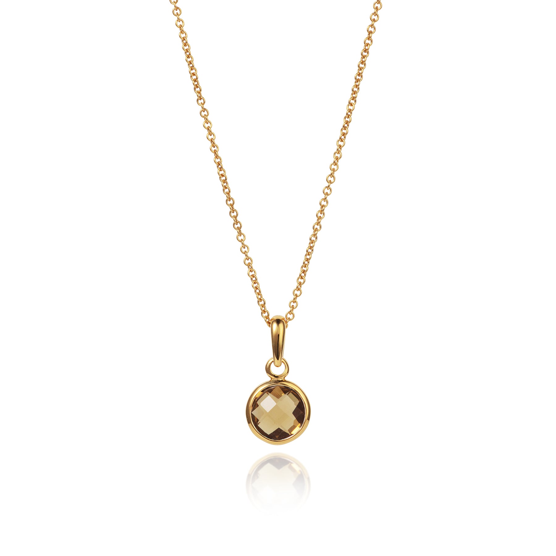 Simple and elegant round natural smoky quartz pendant necklace in 18ct gold vermeil presented on a 45cm gold chain. Selected for their brilliance and cut, smoky quartz represents grounding and protection making a meaningful gift for November birthdays or anyone who loves the cognac hues of smoky quartz.