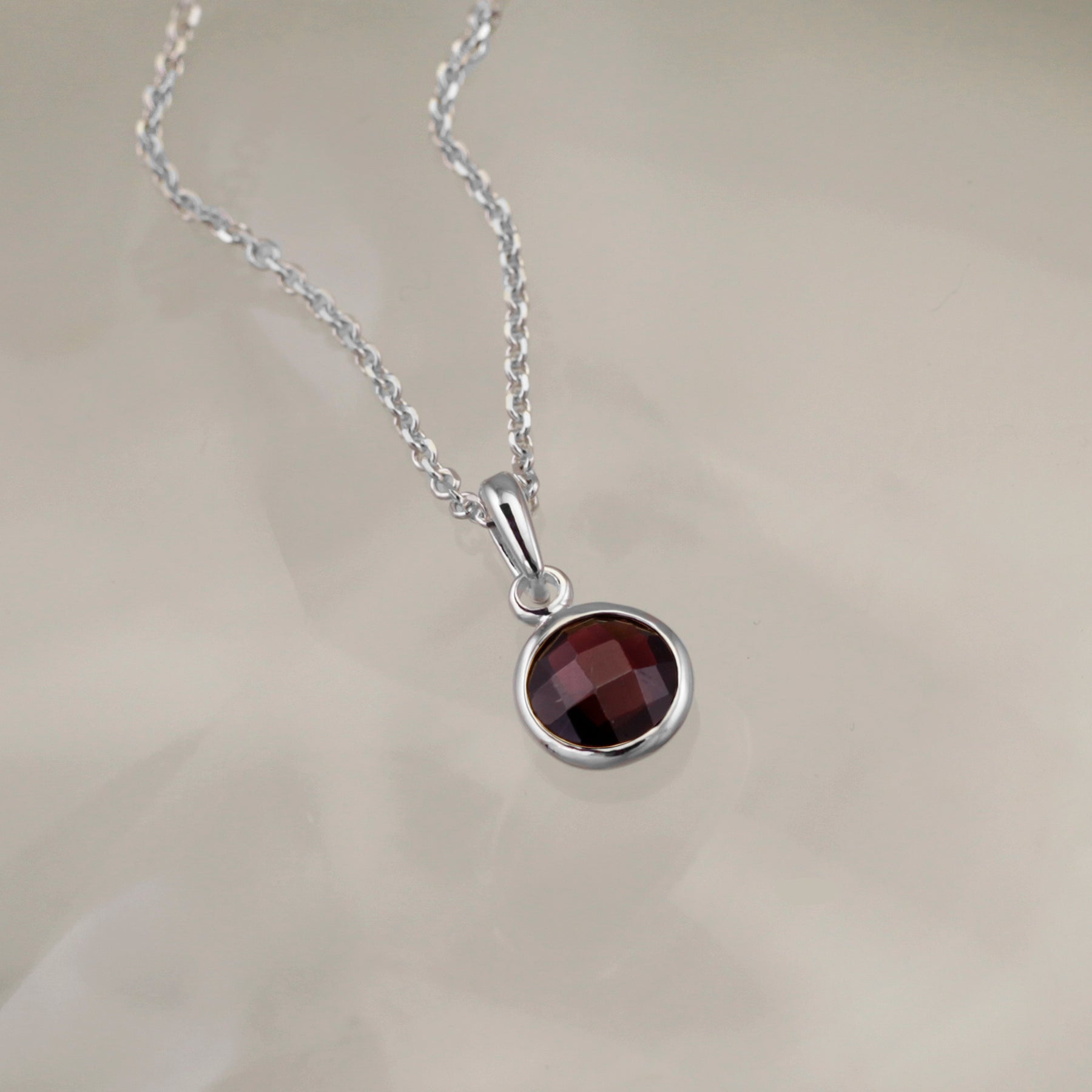 Simple and elegant round garnet gemstone pendant necklace in sterling silver presented on a 45cm silver chain. Selected for their colour and brilliance garnets are the birthstone of January and represent love, strength and protection making a meaningful gift for January birthdays or anyone who loves the warm deep red hues of natural garnet gemstones.