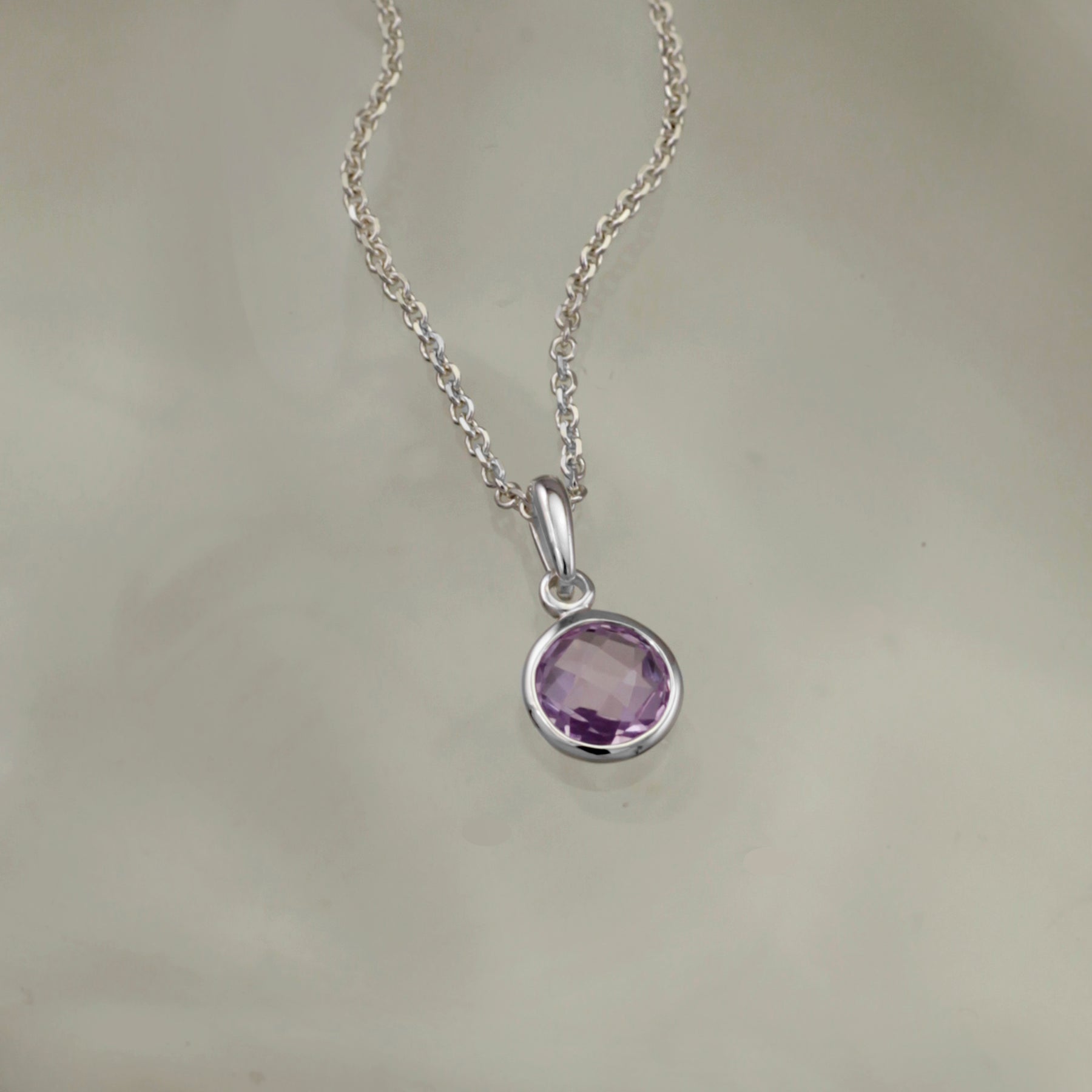 Dainty round silver pendant with an amathyst gemstone on a chain