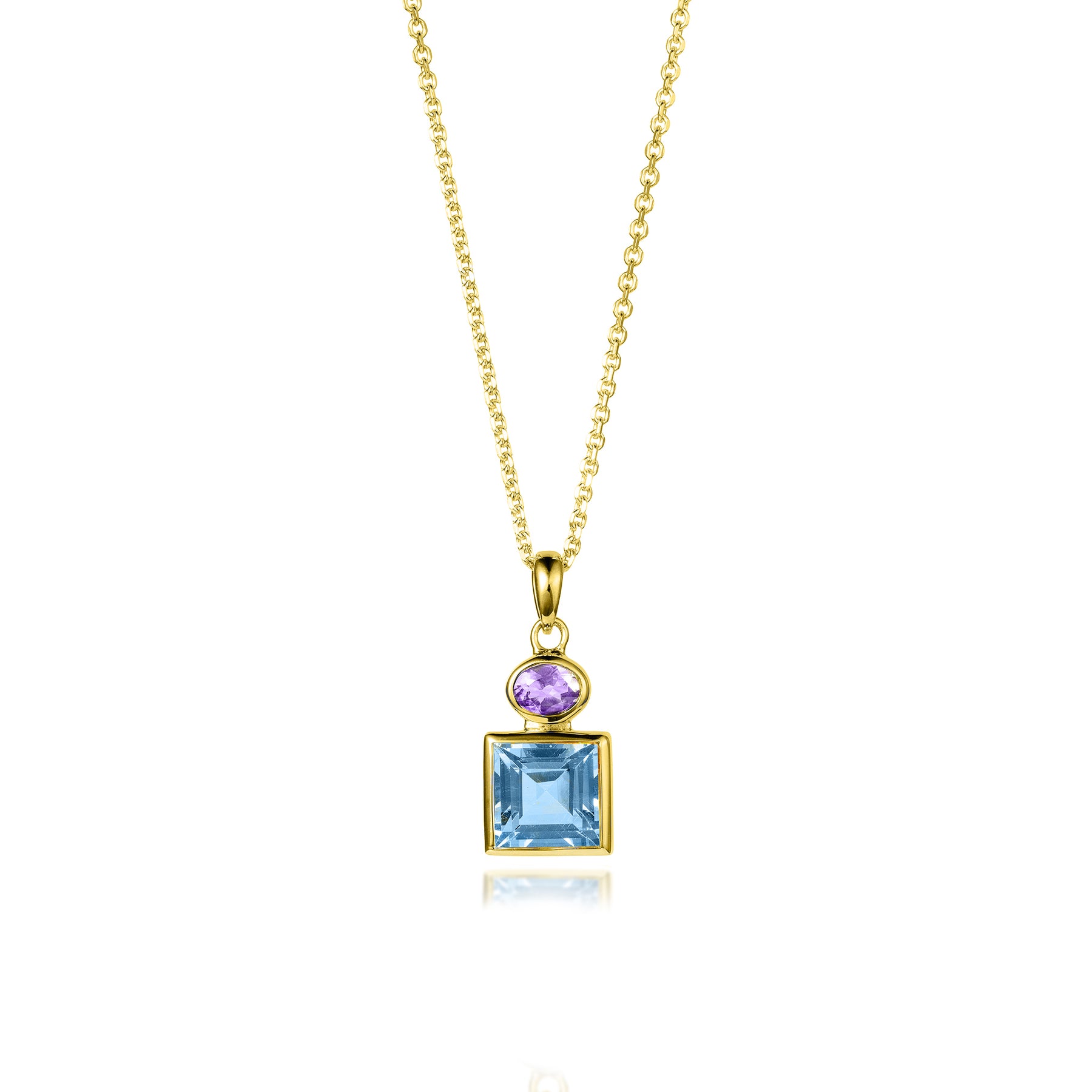 Pretty 18ct gold vermeil gemstone necklace set with square cut blue topaz and Brazilian amethyst gemstones. Carefully chosen for their exceptional quality and cut these two gemstones combine to create a simple yet stunning pendant in both colour and design.