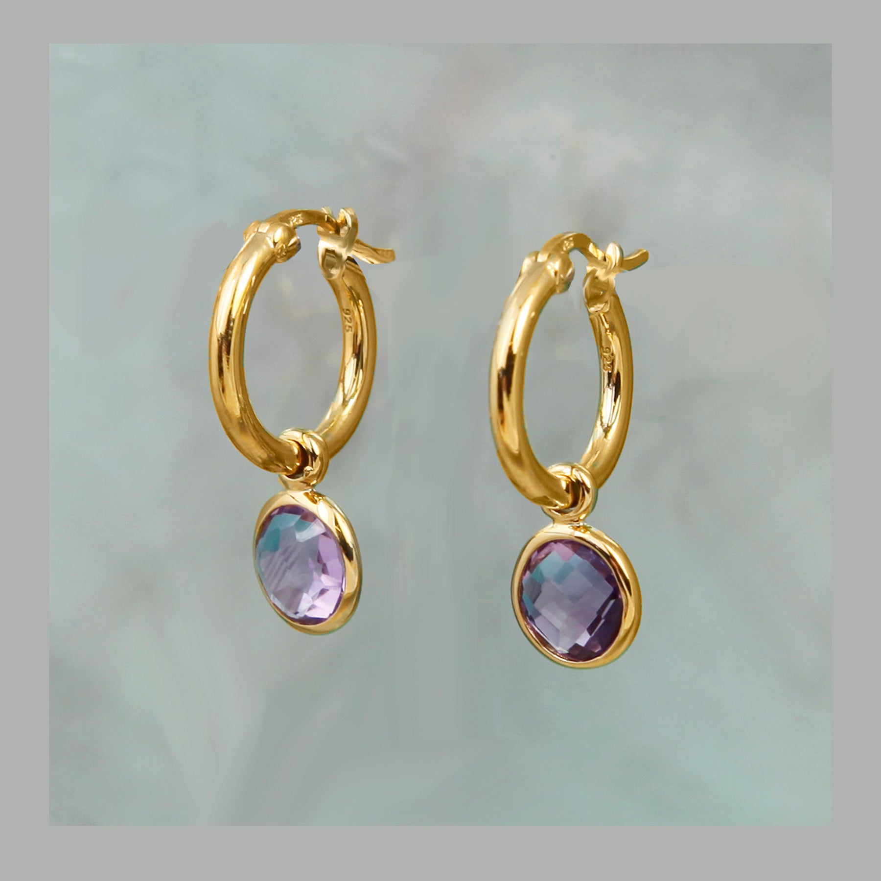 Pretty and very versatile huggie hoop style earring in 18ct gold vermeil with genuine faceted amethyst gemstones.