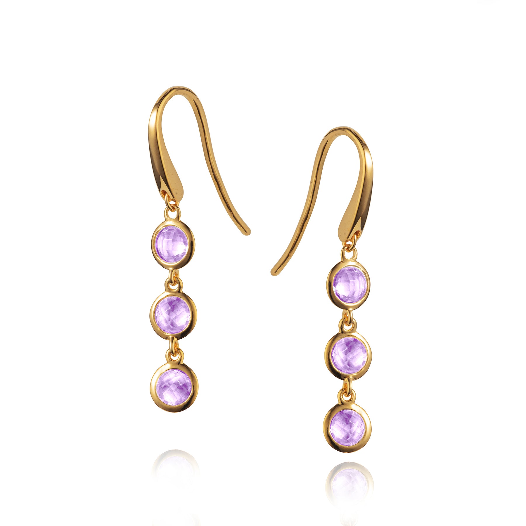 gold triple stone earrings set with purple amethyst on a white background