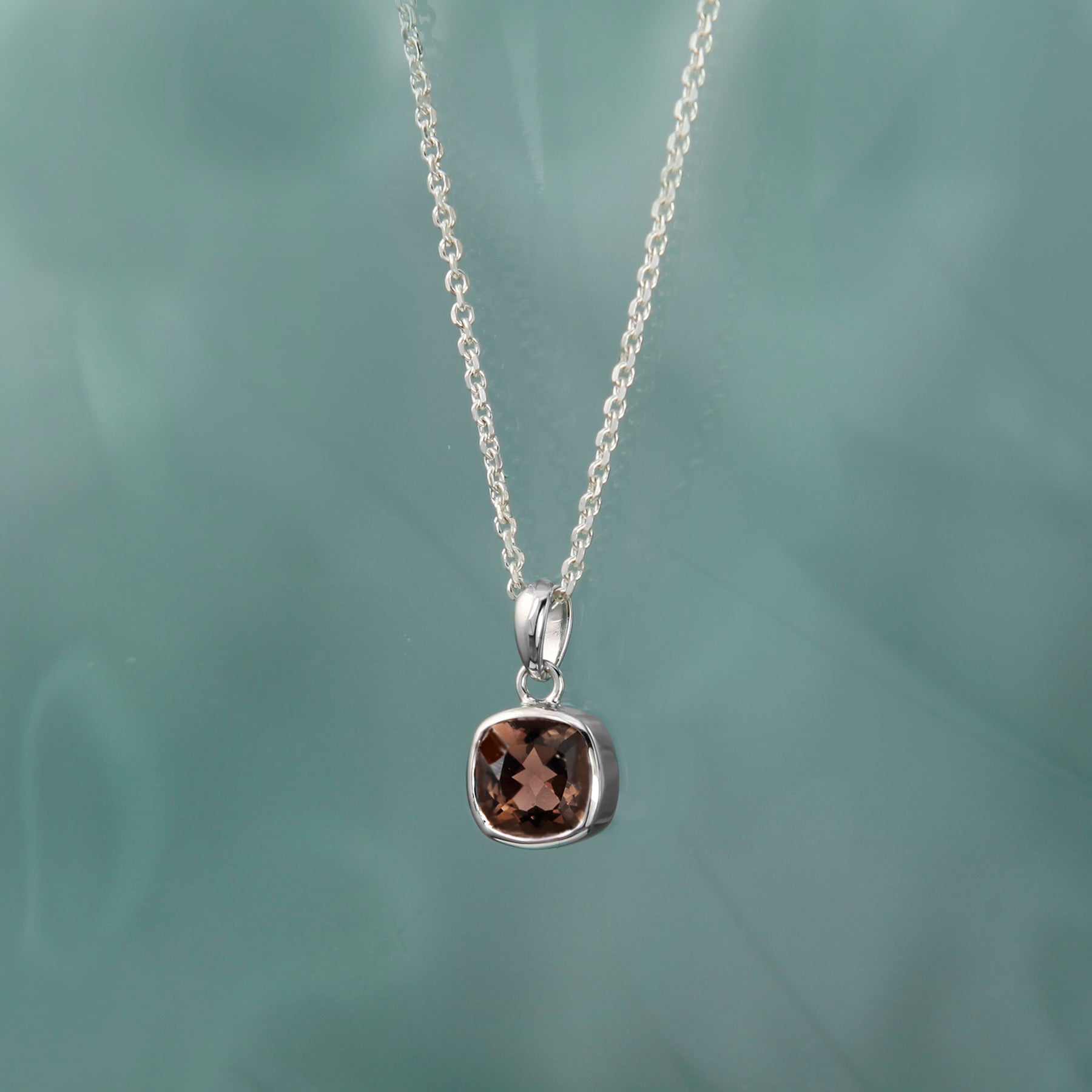 Easy to style, this elegant pendant set with a natural cushion-cut smoky quartz is perfect for adding a pretty colour accent, whatever the occasion.