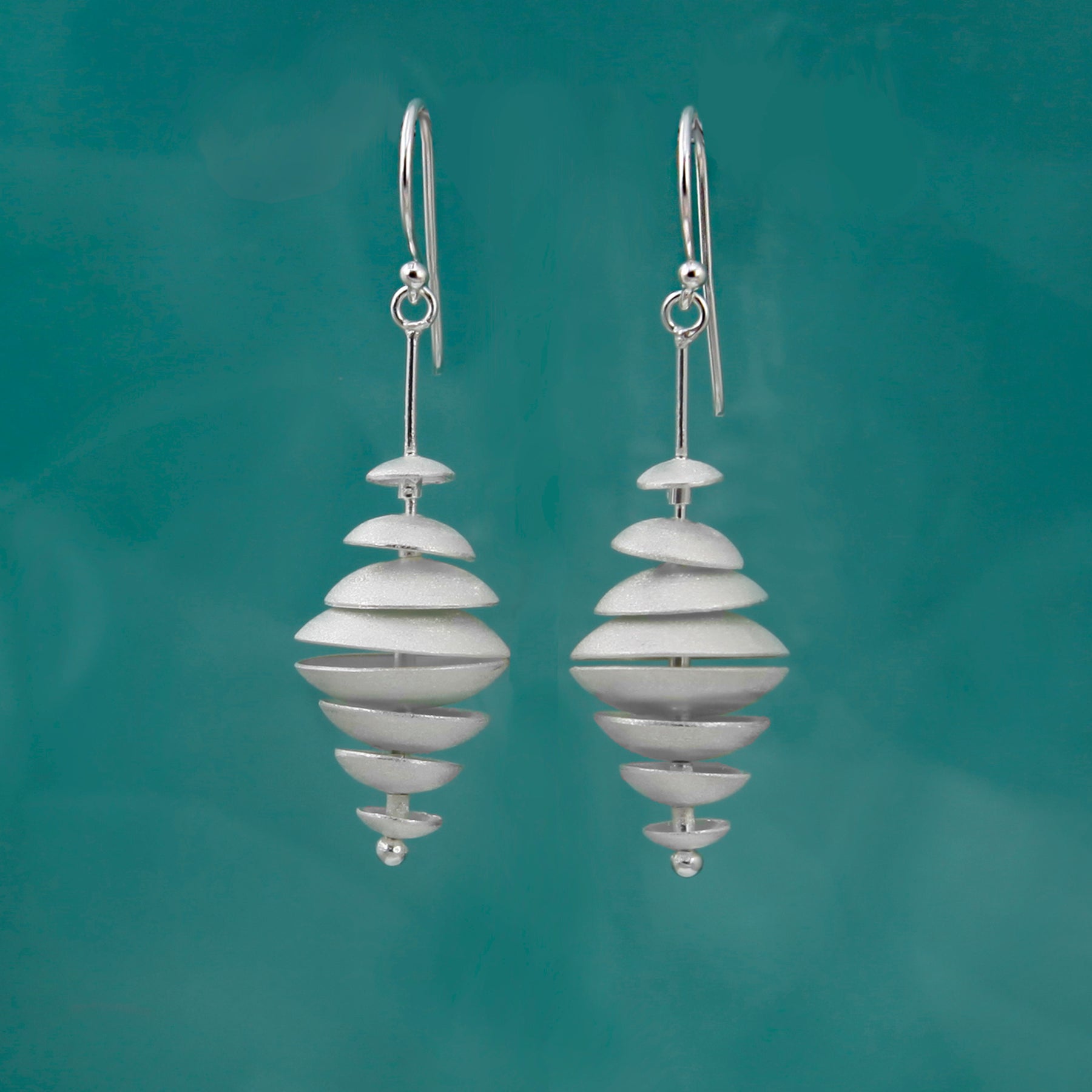 The Topsy Turvy dangly earring is a true original. A series of sterling silver disks with a brushed satin finish drop from French hooks creating a dramatic lightweight earring.