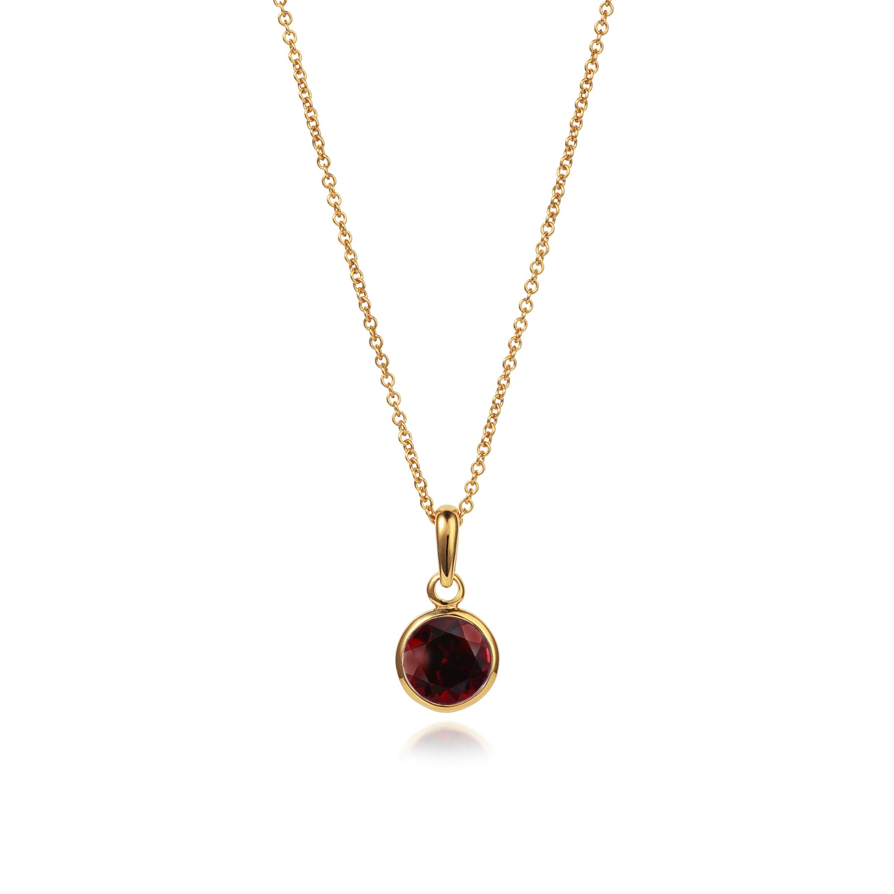 Simple and elegant round garnet gemstone pendant necklace in 18ct gold vermeil presented on a 45cm gold chain. Selected for their colour and brilliance garnets are the birthstone of January and represent love, strength and protection making a meaningful gift for January birthdays or anyone who loves the warm deep red hues of natural garnet gemstones.