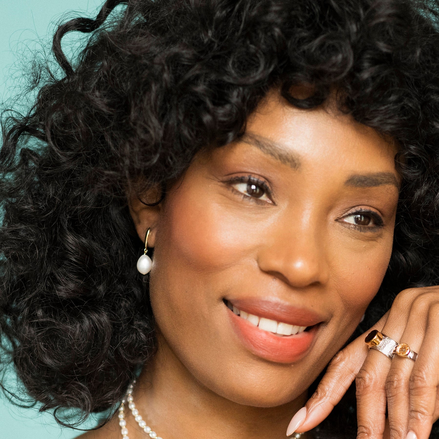 Woman wearing silver pearl drop earrings and a ring against a teal background