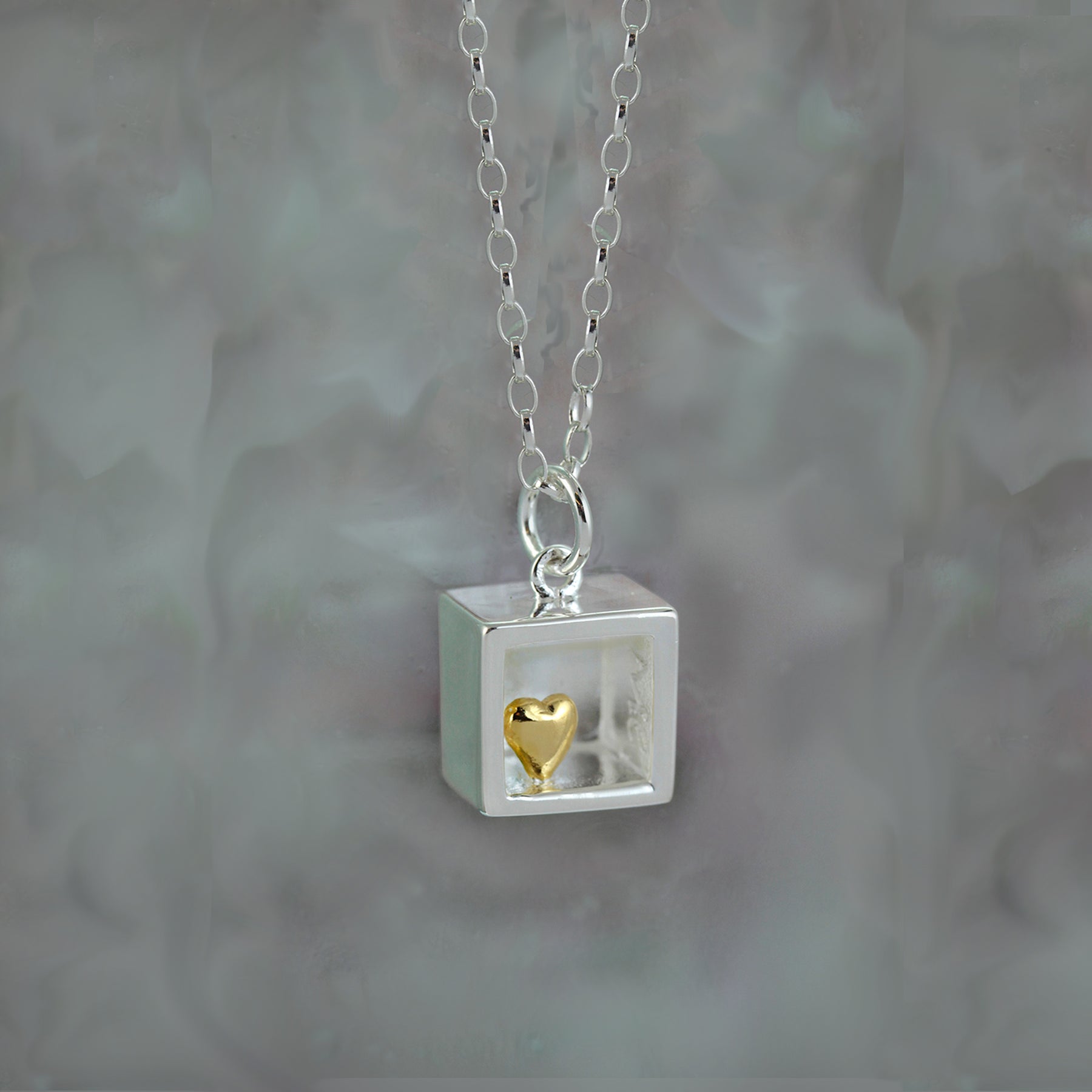 Designed to celebrate love the Heart Of Gold pendant is a beautifully crafted sterling silver box with a pretty 18k gold plated puff heart and comes on a 24 inch silver chain.