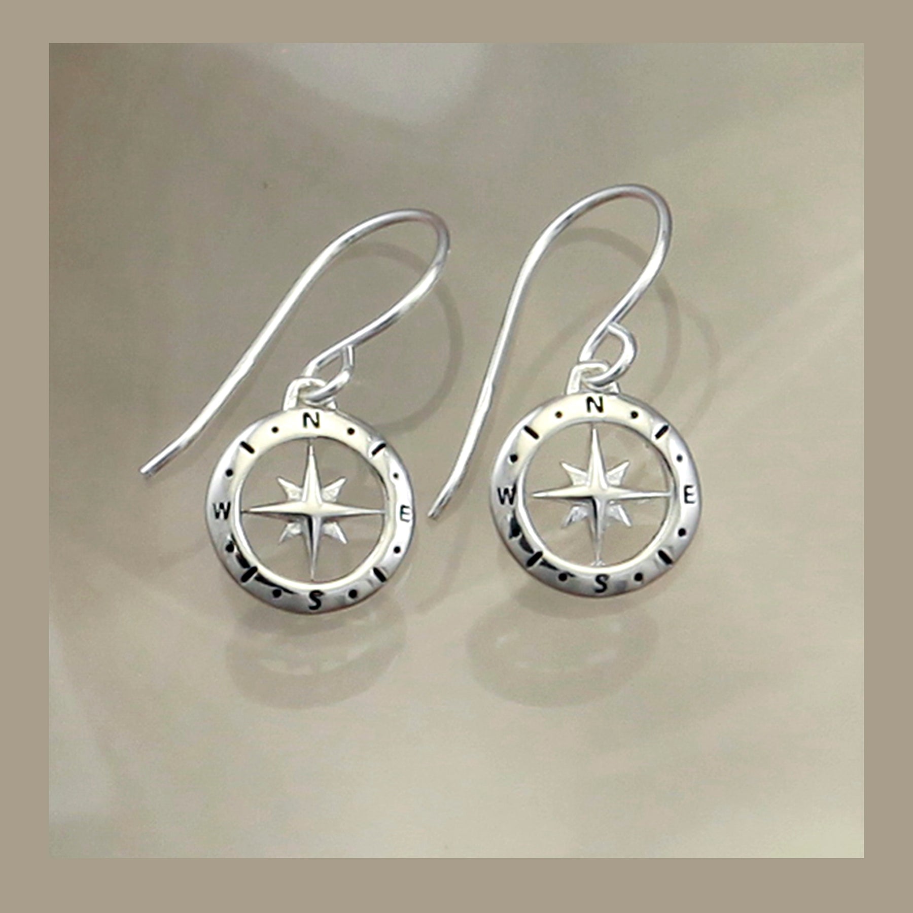 The perfect gift for anyone embarking on one of life's adventures. A reversible small drop talisman earring handcrafted in sterling silver with the four cardinal points of the compass on one side and the word 'love' on the reverse.