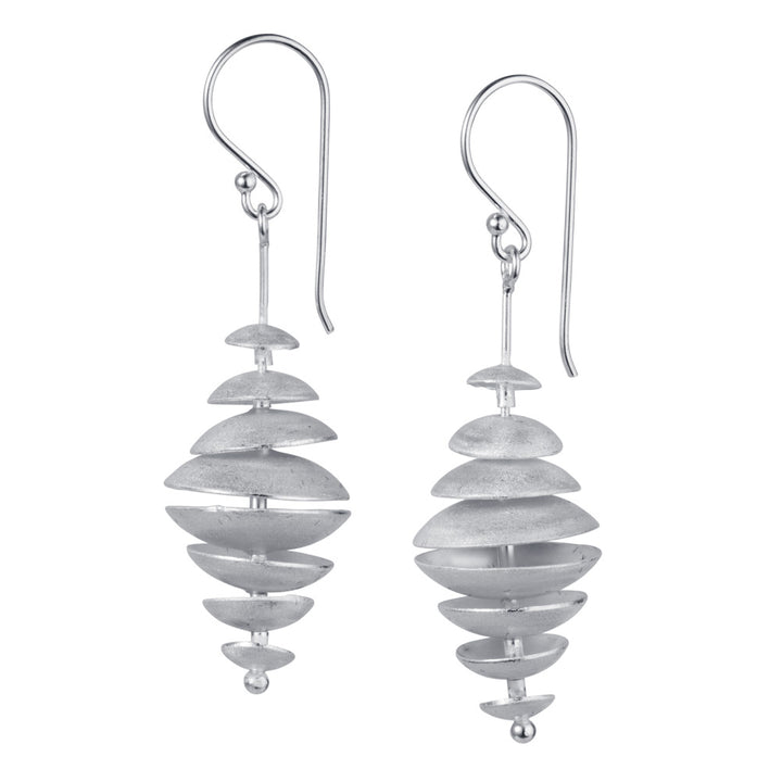 The Topsy Turvy dangly earring is a true original. A series of sterling silver disks with a brushed satin finish drop from French hooks creating a dramatic lightweight earring.