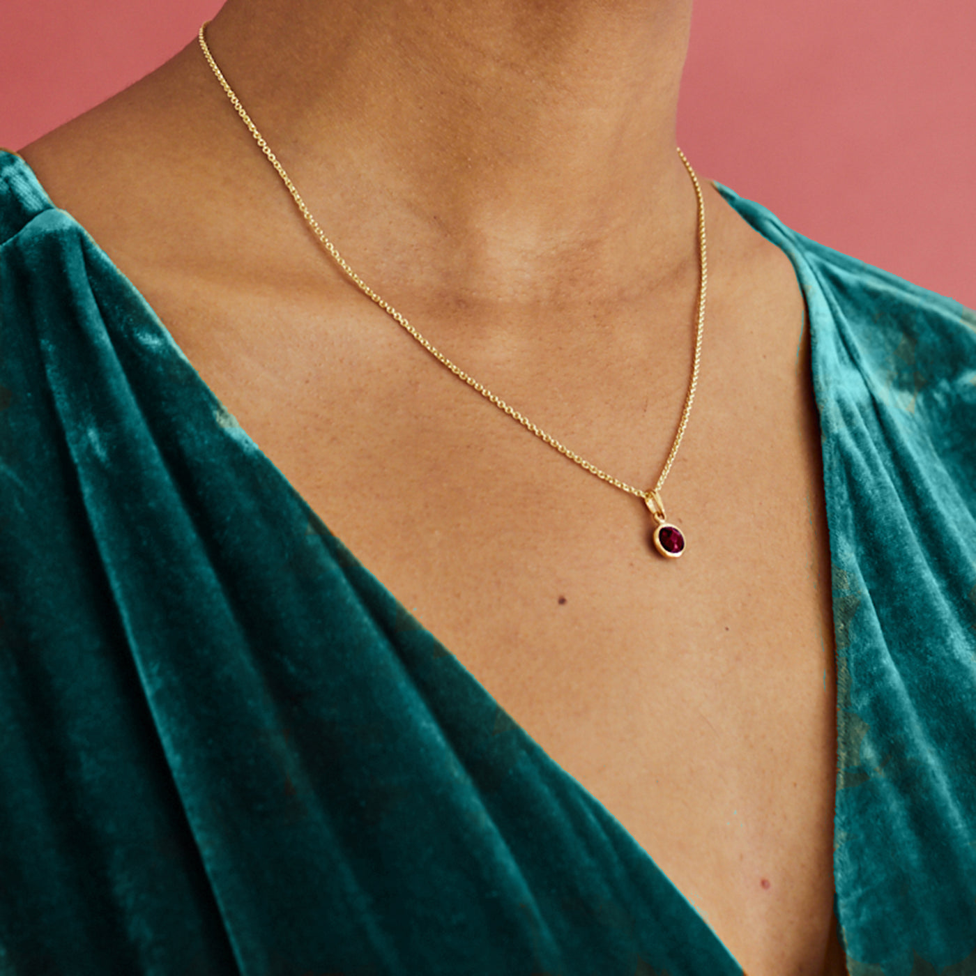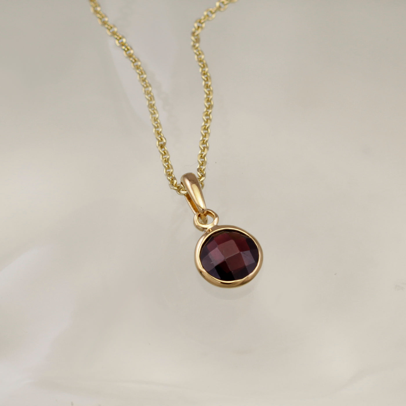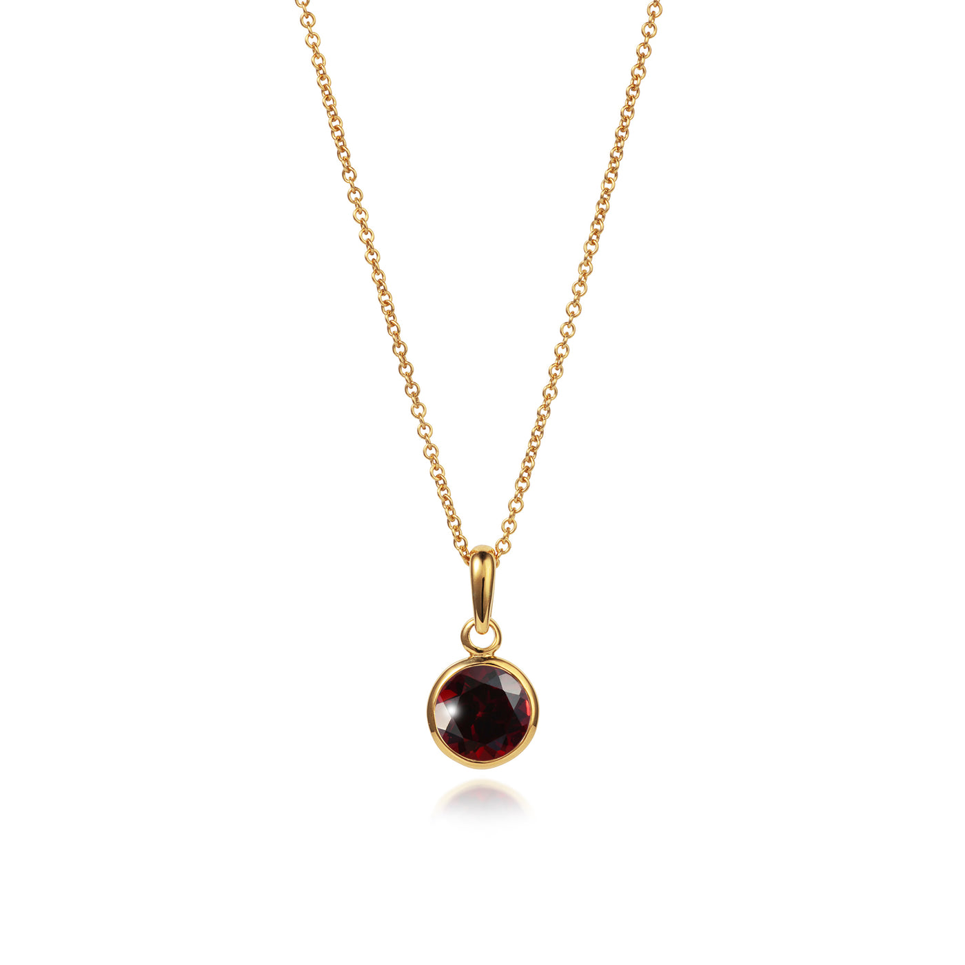 Minimal and easy to style this pretty 18ct gold vermeil pendant is set with a round, faceted garnet gemstone. Perfect for adding a warm colour accent, red garnet is the birthstone of January.