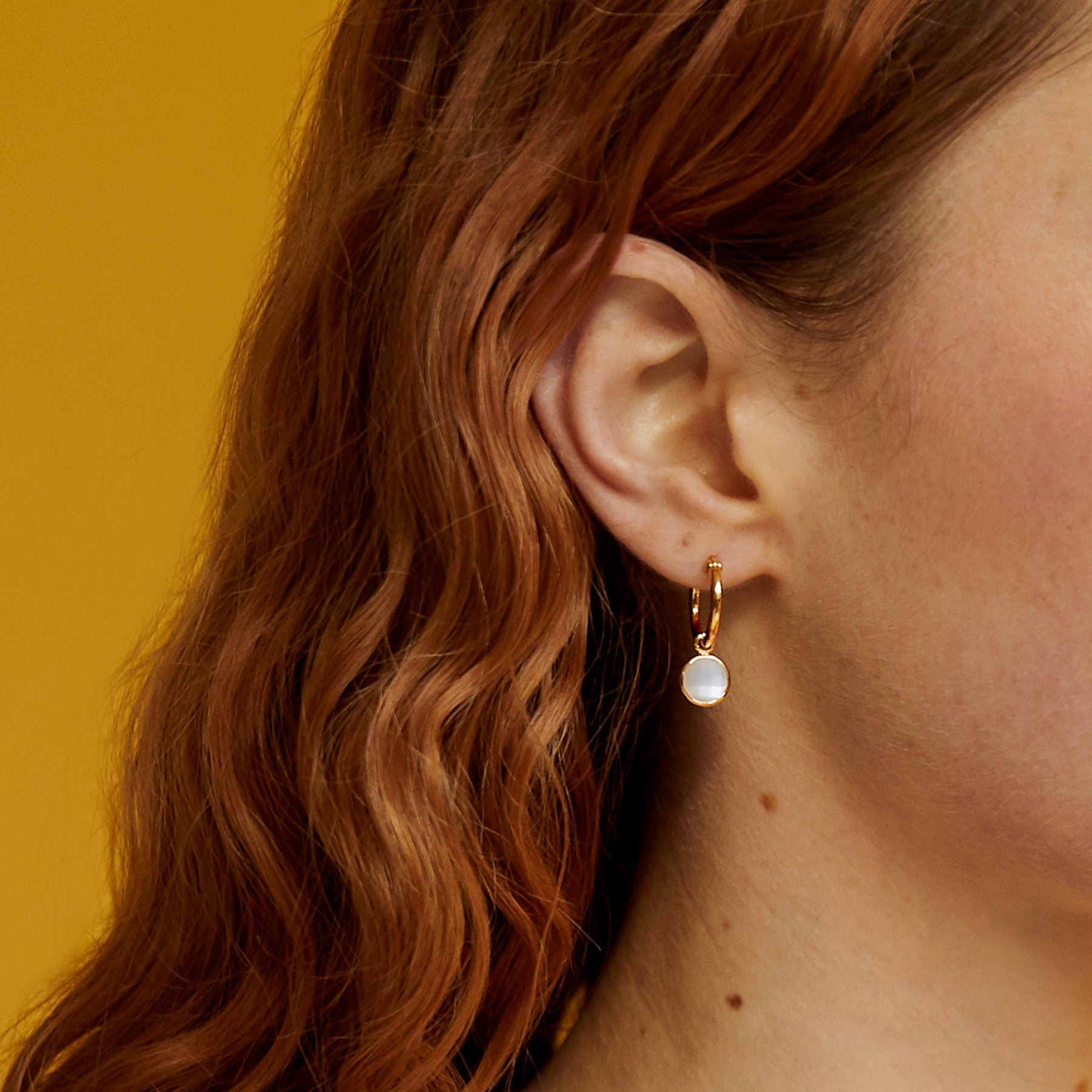 Model wearing gold huggie style hoop earrings with moonstone drops on a yellow background.